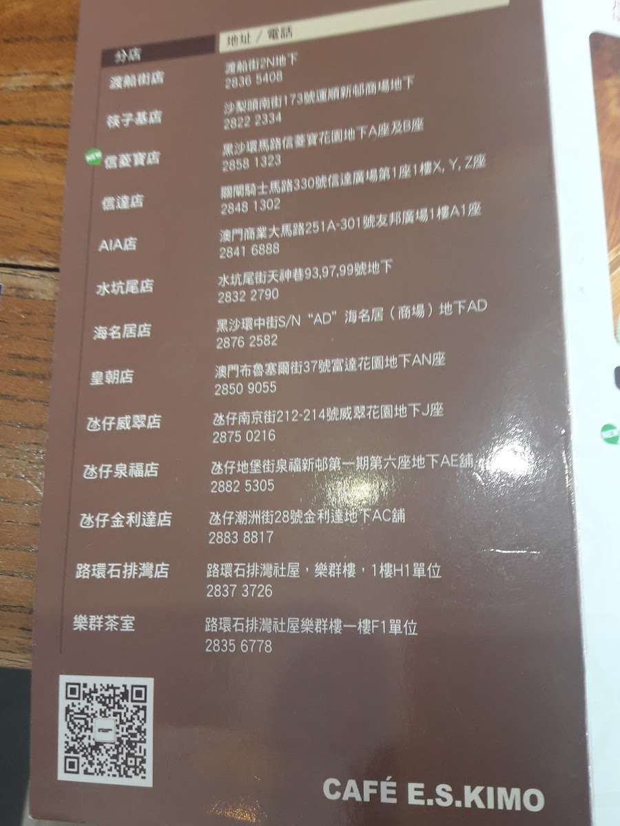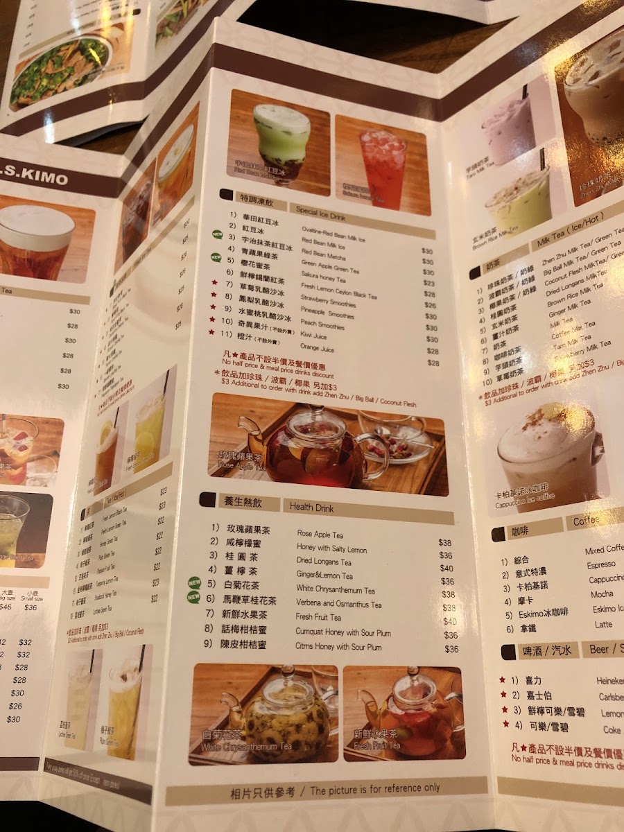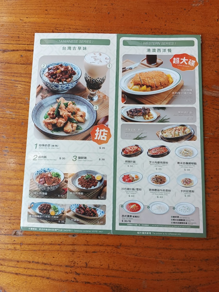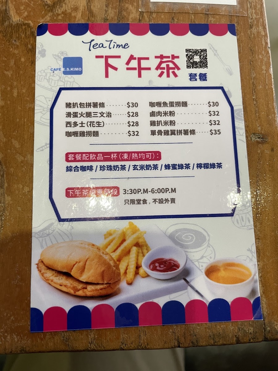 The menu at Café E.S.Kimo offers a blend of Taiwanese and Macanese cuisine alongside a variety of beverages. Visitors can find coffee and tea options, including specialty drinks such as Coffee Milk Tea and flower tea. The food selection includes traditional Taiwanese items like Taiwanese Sausage and Pork Bun, as well as Macanese dishes such as 三杯雞飯 (Three Cups Chicken Rice) and辣味涼拌黃瓜 (spicy cold cucumber salad). Additionally, items featuring Adzuki Beans are available.