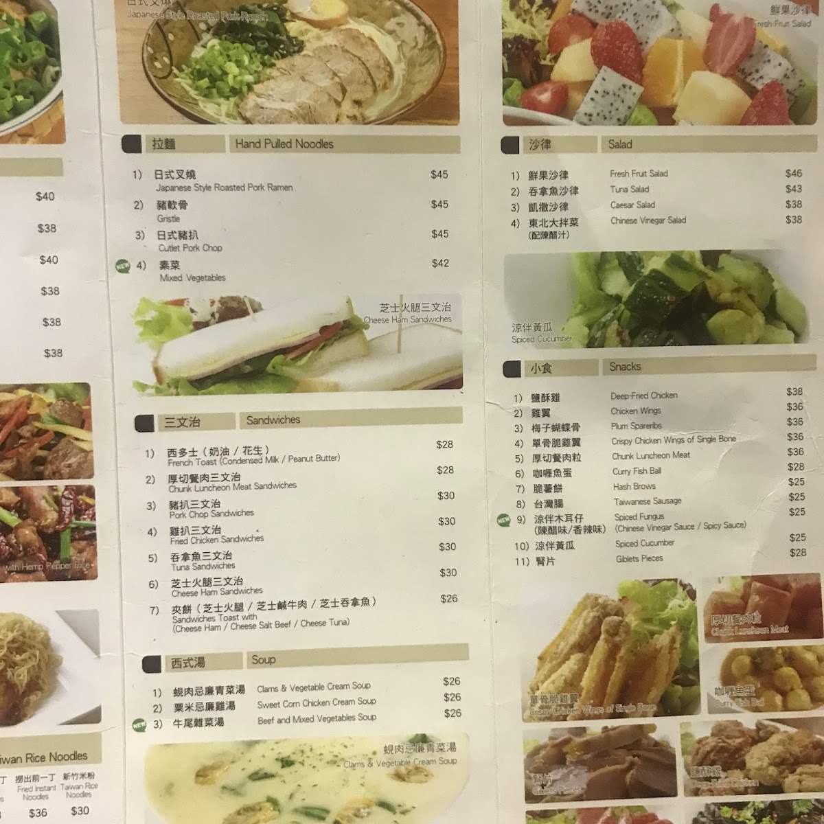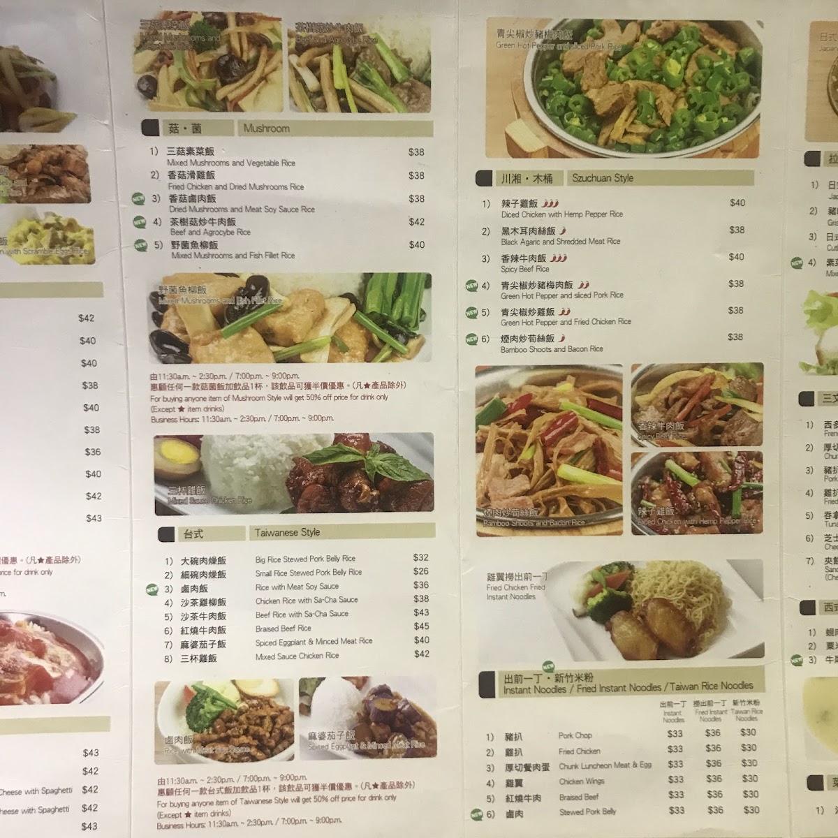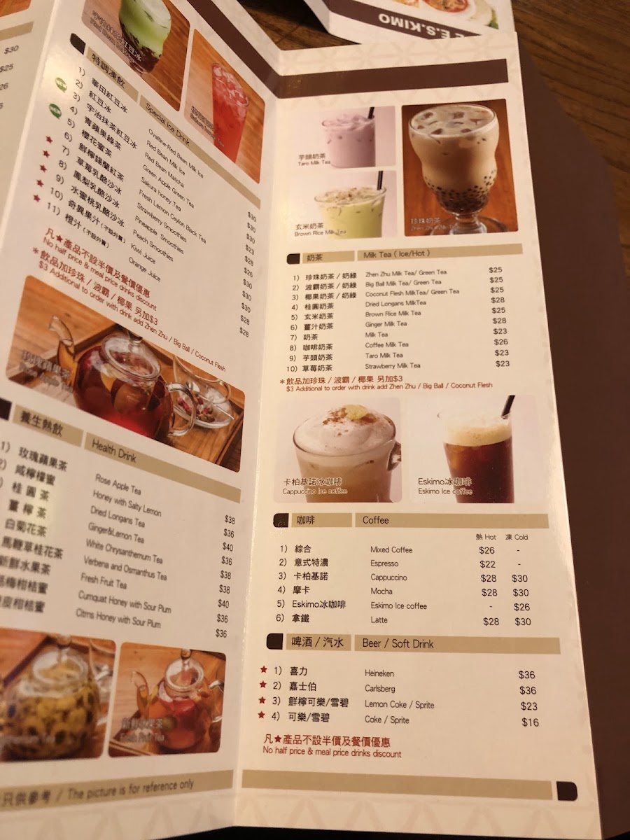 The menu at Café E.S.Kimo offers a blend of Taiwanese and Macanese cuisine alongside a variety of beverages. Visitors can find coffee and tea options, including specialty drinks such as Coffee Milk Tea and flower tea. The food selection includes traditional Taiwanese items like Taiwanese Sausage and Pork Bun, as well as Macanese dishes such as 三杯雞飯 (Three Cups Chicken Rice) and辣味涼拌黃瓜 (spicy cold cucumber salad). Additionally, items featuring Adzuki Beans are available.